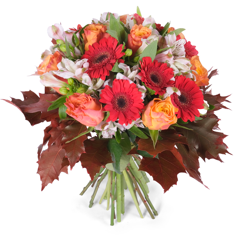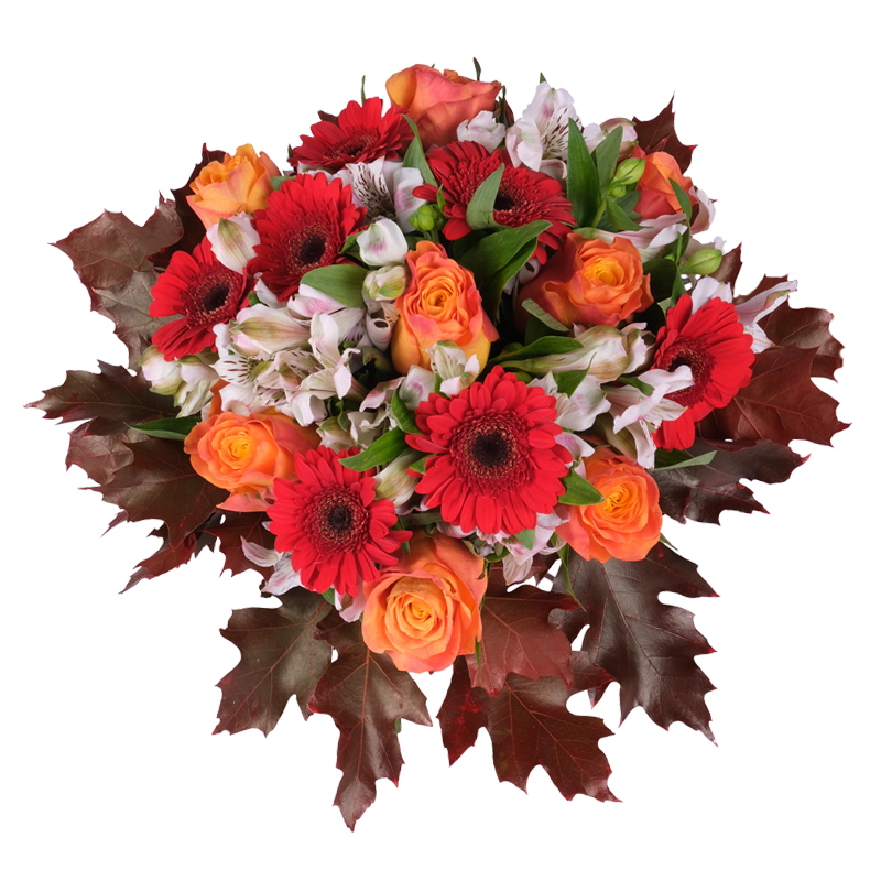 Subtelny bukiet z róż, gerber i alstromerii zachwyca swoją prostotą i klasą. Liście klonu dodają mu nieco swobodnego, naturalnego stylu. To propozycja idealna na każdą okazję. Przynosi radość i pozytywną energię. Z pewnością wywoła uśmiech na twarzy obdarowanej osoby!