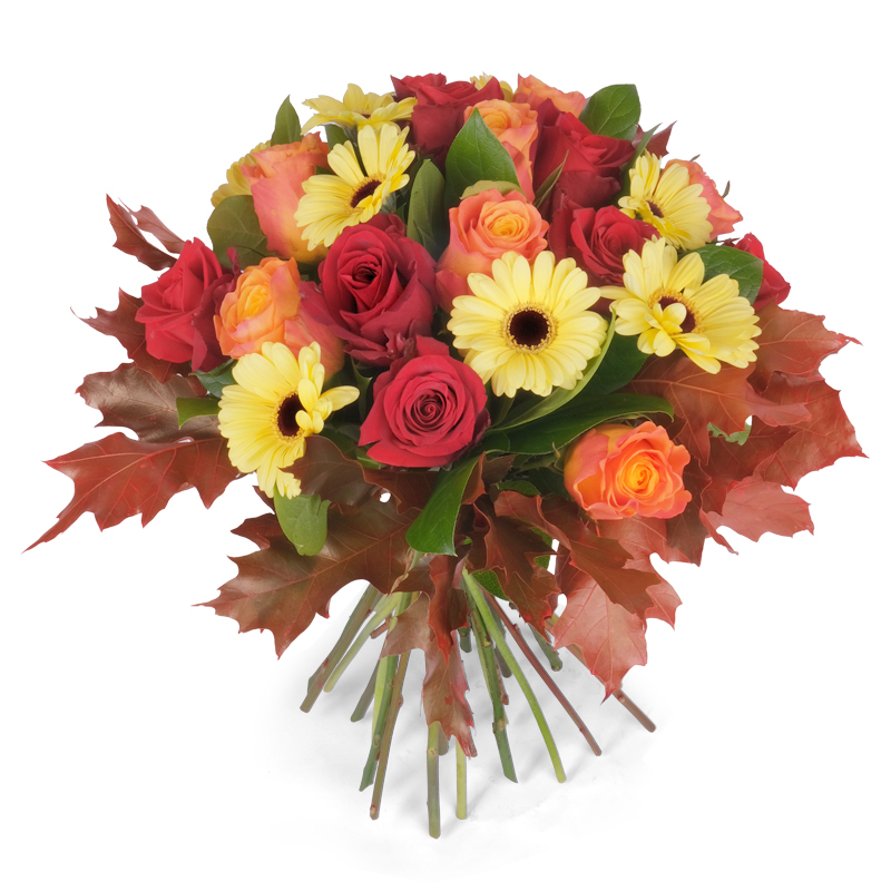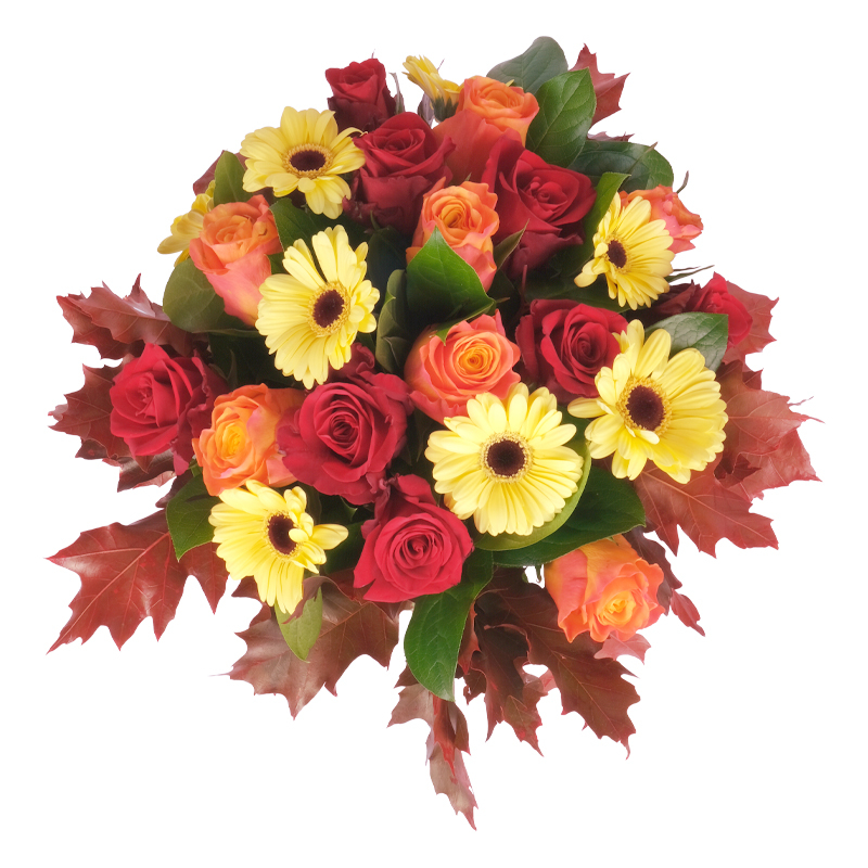 Bukiet „Obfita Jesień” to doskonały sposób, by dodać wnętrzu elegancji. Róże i gerbery tworzą razem klasyczną, harmonijną całość. Liście klonu pięknie ją uzupełniają. To propozycja pełna uroku i stylu. Idealna na każdą okazję... albo bez!
